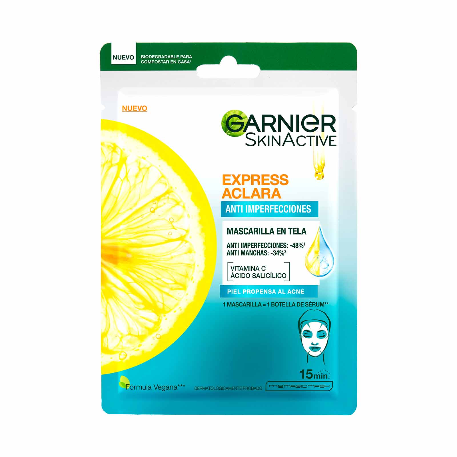 Nueva Mascarilla en Tela Anti Imperfecciones Express Aclara para una piel uniforme y visiblemente reducción de imperfecciones, enriquecida con (Ácido Salicílico + Vitamina C).